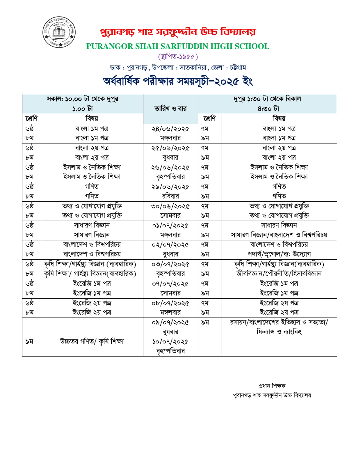 অর্ধবার্ষিক পরীক্ষার রুটিন ২০২৫ ইং।
